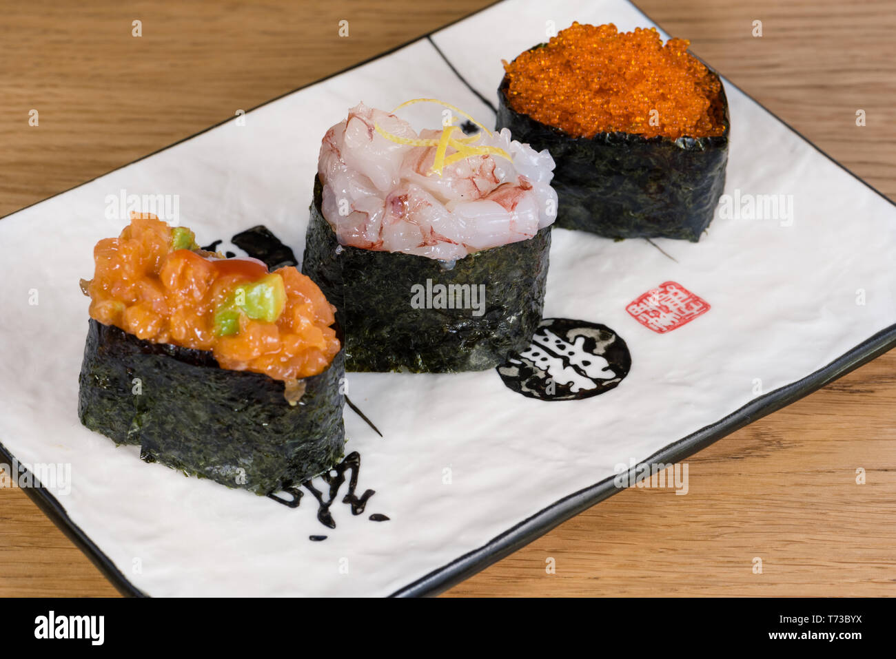 Mix Of Gunkan With Salmon And Avocado Tartare Shrimp Meat And